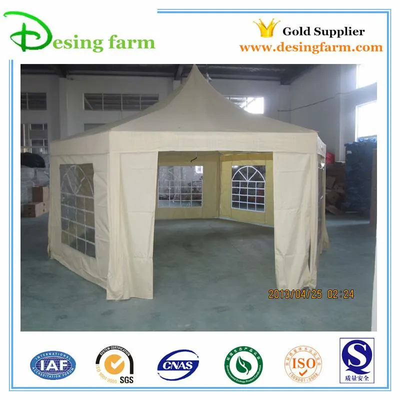 | PA2020 | 6X6M pagoda tent.Frame:powder coated steel pipe,33x0.85mm, 28x0.85mm, connector 32x1.35mm,38x1.35. Fabric:230g/m2 Polyester,PVC coated; Packed in one box. With one PC of 84x37.5cm color label Loadability:325pcs/40'hq. |