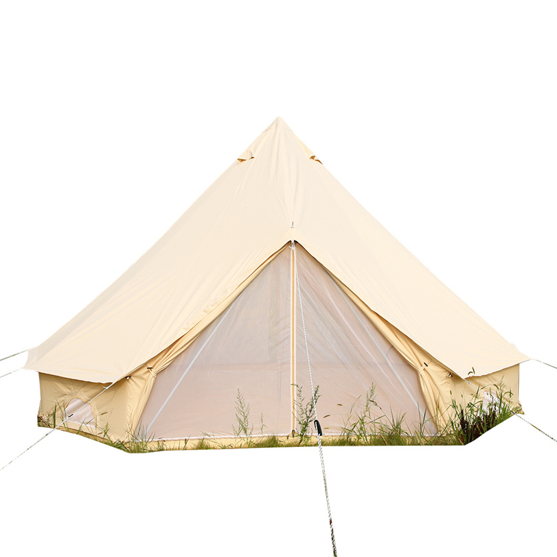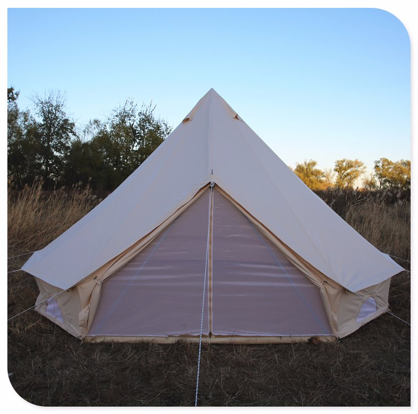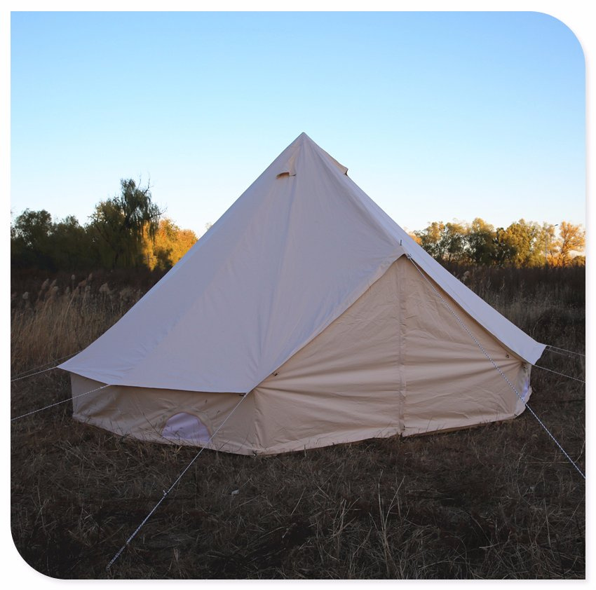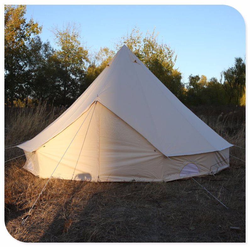 The Bell Tent is made of 300 gsm waterproof cotton canvas PU coated with a durable zip-in groundsheet. They have two spring-loaded poles - a central pole and an A-frame pole which creates a porch in the doorway. The tent has air vents, mesh windows with zips and an extra-large carry bag for easy pac......